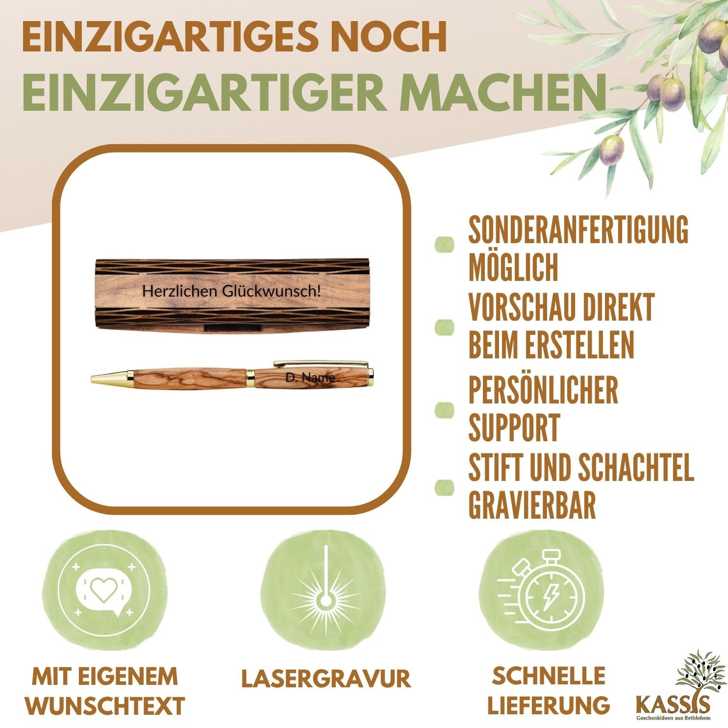 🌿HANDGEFERTIGT: Jeder Holz-Kugelschreiber wird von erfahrenen Handwerkern in Bethlehem handgefertigt und sorgfältig bearbeitet, um höchste Qualität zu gewährleisten. Auch perfekt als Werbegeschenk mit eigener Gravur.